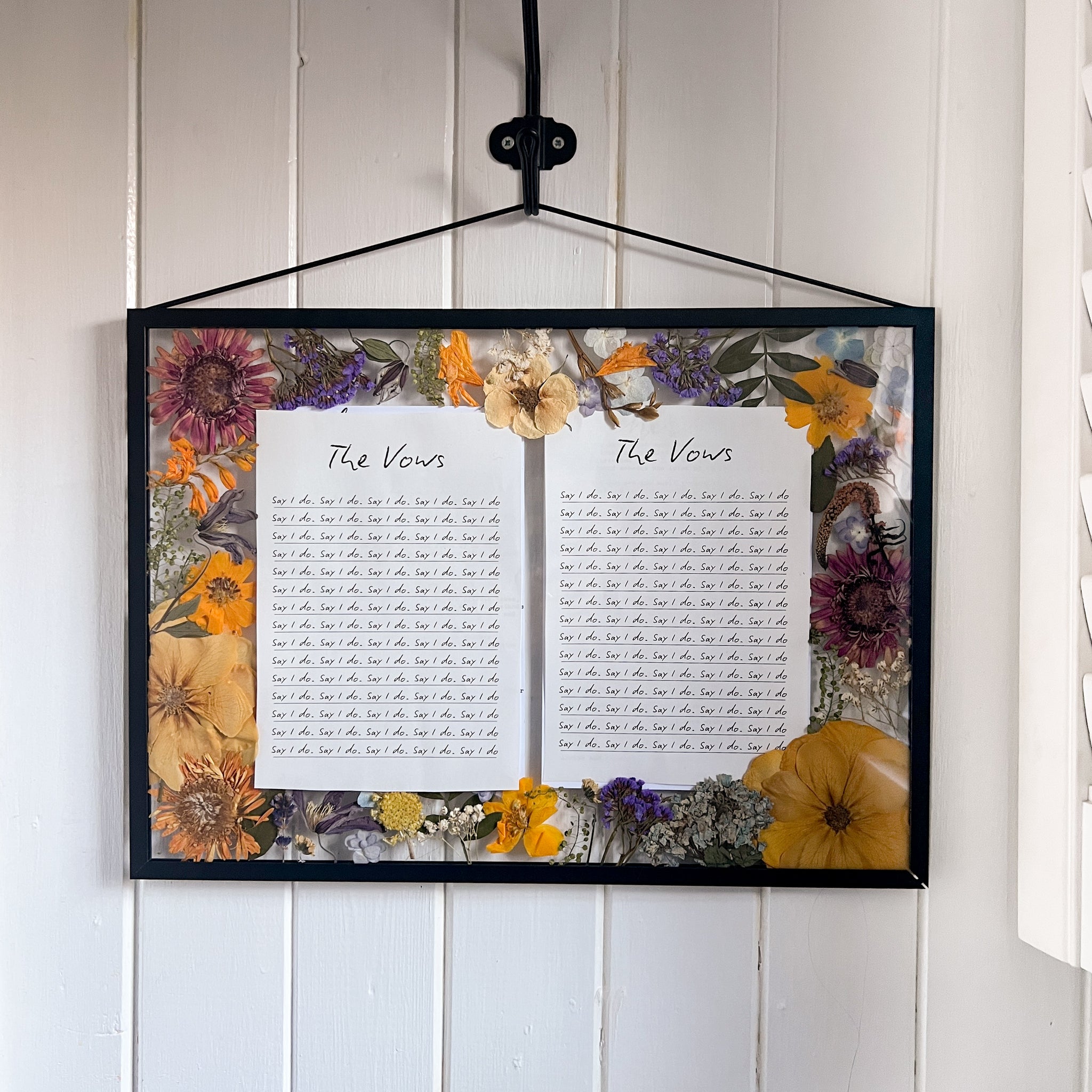 Preserve the magic of your wedding day with my Personalised Bespoke Black Wedding Vow Frame. I handcraft each frame using pressed flowers and your handwritten or printed vows, creating a meaningful keepsake that captures the beauty, emotion, and connection of your special day. It makes a heartfelt gift for a loved one or a stunning addition to your home.